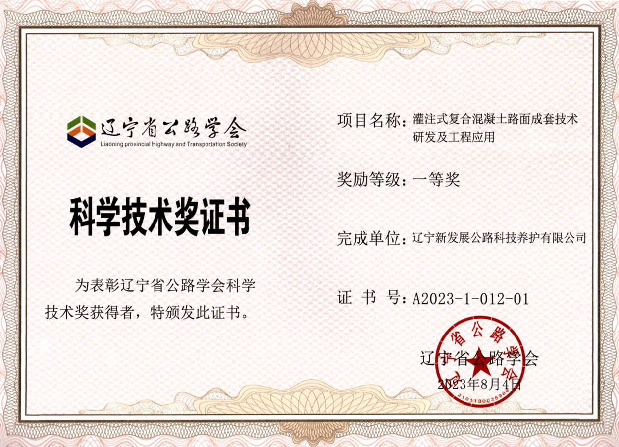 1、“灌注式復(fù)合混凝土路面成套技術(shù)研發(fā)及工程應(yīng)用”項(xiàng)目成果榮獲2023年度遼寧省公路學(xué)會(huì)科學(xué)技術(shù)一等獎(jiǎng):