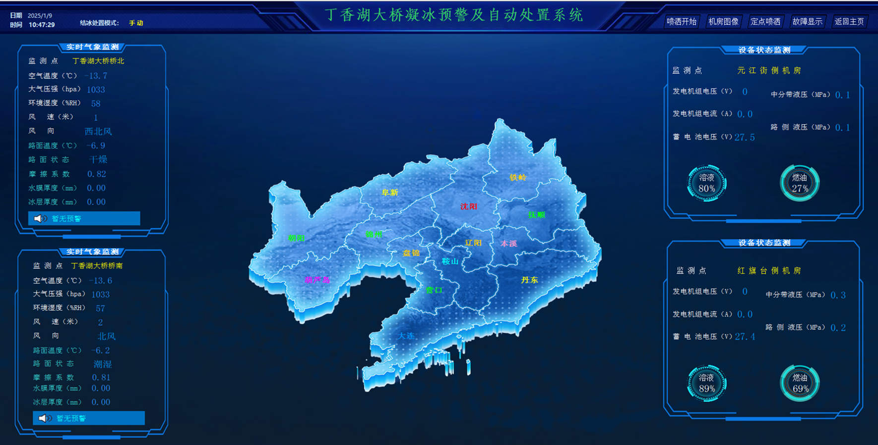 沈陽(yáng)繞城高速后丁香大橋(下行,大連方向)布設(shè)的“橋面凝冰預(yù)警及自動(dòng)化處置系統(tǒng)”已投入使用,能夠捕捉不受路面介質(zhì)影響的真實(shí)冰點(diǎn),實(shí)行橋面凝冰的感知和預(yù)先處置,使橋面防凝冰效果取得實(shí)效,確保冬季橋面的行車(chē)安全,真正實(shí)現(xiàn)了從被動(dòng)除冰到主動(dòng)防冰的轉(zhuǎn)變。